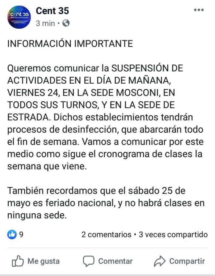 El antiguo edificio donde funcionaba el Colegio Dr. Ernesto Guevara, reciclado como anexo del CENT 35 luego de la inauguración de apuro de la nueva sede, tiene una larga historia de suspensión de actividades por presencia de roedores. Nada ha cambiado en relación a eso. Desde hace varios días, quienes desarrollan actividades en el mencionado anexo de la calle Mosconi no pueden hacerlo con normalidad por las repetidas “desinfecciones” y “tareas de limpieza”.