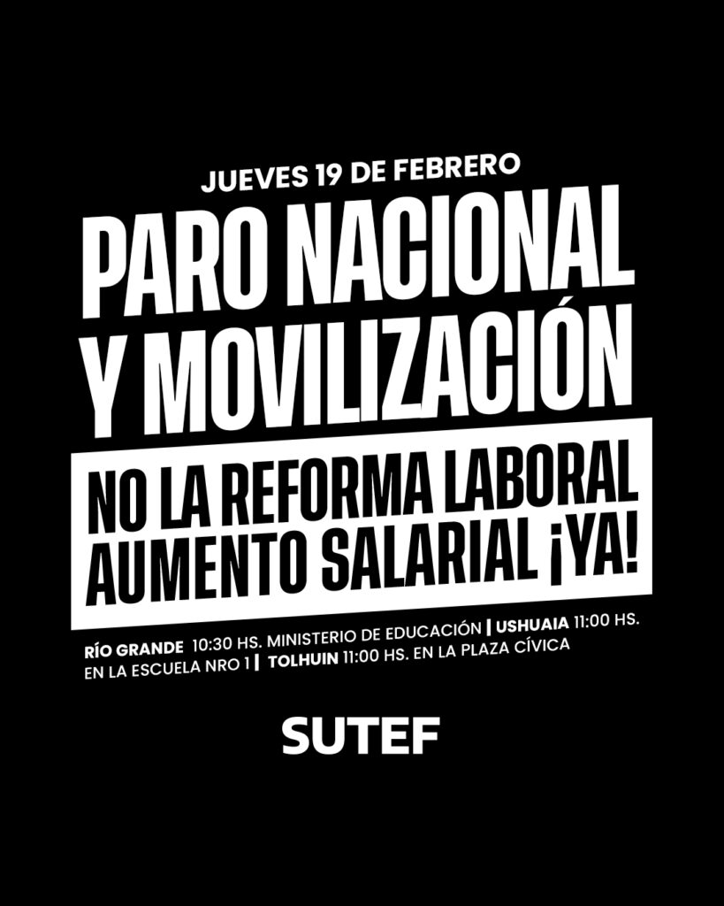El Sindicato Unificado de las Trabajadoras y Trabajadores de la Educación Fueguina (SUTEF) adhiere al PARO NACIONAL convocado por el Frente de Sindicatos Unidos (FreSU), la CTA Autónoma y la CTA de los Trabajadores para este jueves 19 de febrero en el marco del tratamiento de la reforma laboral regresiva en la Cámara de Diputados.