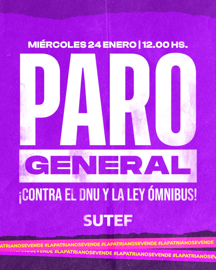 ⛔️ ¡NO al DNU y a la Ley Ómnibus!Desde el Sindicato Unificado de Trabajadoras y Trabajadores de la Educación Fueguina adherimos al Paro General Nacional convocado por las centrales obreras para el próximo miércoles 24 de enero.