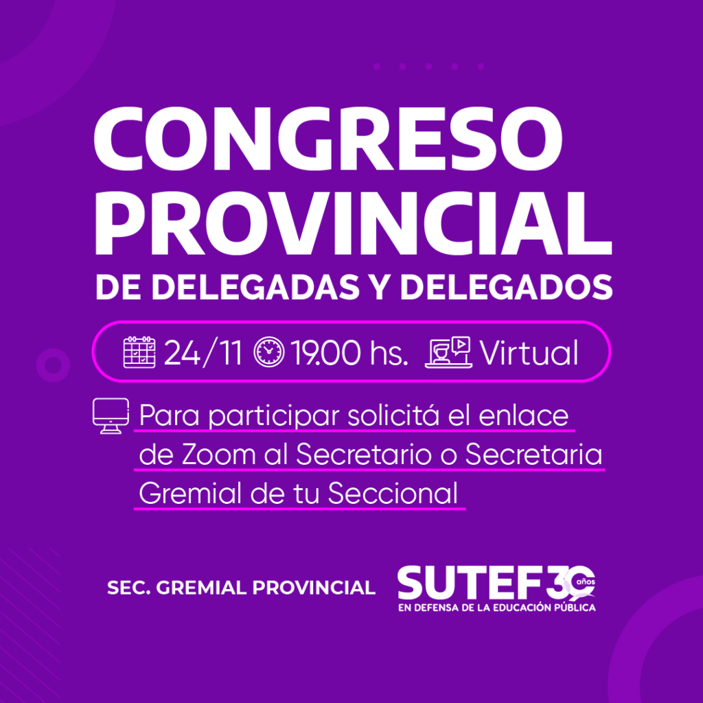El Sindicato Unificado de Trabajadoras y Trabajadores de la Educación Fueguina, SUTEF, convoca a Congreso Provincial de delegadas y delegados en formato virtual.