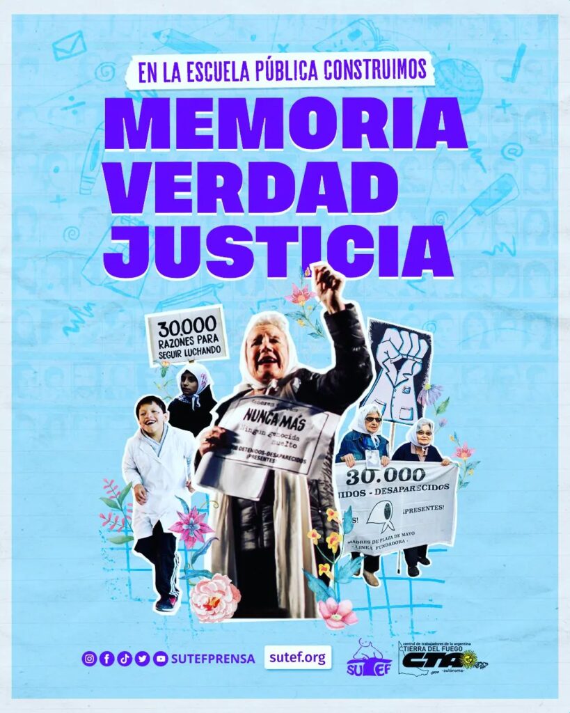 En Ushuaia nos encontramos a las 16.00 hs. en San Martín y Fadul donde se realizará un Acto Central junto a la Multisectorial de Derechos Humanos de Ushuaia. Habrá radio abierta, bandas e intervenciones artísticas e intervenciones sobre los barbijos con las consignas históricas como Nunca Más; Son 30.000; ¿Dónde están? entre otras.