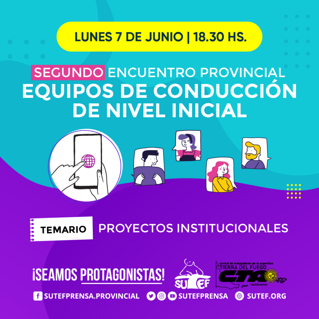 Convenio Colectivo de TrabajoConvocatorias2do. Encuentro con equipos de Conducción de Nivel Inicial 2do. Encuentro con equipos de Conducción de Nivel Inicial publicado el 4 junio, 2021 FacebookTwitterPinterestWhatsAppEmailImpresiónTelegramCopy URL 💬 2do. Encuentro con equipos de Conducción de Nivel Inicial🗓 Lunes 7 de Junio | 18.30 Hs.| 📝 Temario: Proyectos Institucionales. ¡Solicitá link para participar! Adriana: 2964-605987 o Julio: 11-56066032 Últimos artículos Comunicados / Informes / Noticias ¡URGENTE! SUTEF Convoca a congreso provincial de delegadas/os este lunes 3/11 Desde el Sindicato Unificado de las Trabajadoras y Trabajadores de la Educación Fueguina (SUTEF)... 3 noviembre, 2025 Comunicados / Informes / Noticias Solidaridad con la docencia de la Escuela Especial Kayú Chénèn El Sindicato Unificado de Trabajadoras y Trabajadores de la Educación Fueguina (SUTEF) expresa su... 1 noviembre, 2025 Más publicaciones Convocatorias CCT: reunión provincial con docencia de los Centros Populares de Cultura 🙋♀️ Se convoca a la docencia de los Centros Populares de Cultura a reunión... 2 julio, 2024 Convocatorias CCT: reunión provincial con maestras/os de lengua extranjera inglés 🙋♀️ Se convoca a maestras/os de lengua extranjera inglés de la provincia a participar... 17 junio, 2024 Convocatorias CCT: reunión provincial con bibliotecarias/os de Inicial, Primaria y Modalidades 🙋♀️ Se convoca a bibliotecarias/os de Inicial, primaria y modalidades de la provincia a... 6 junio, 2024