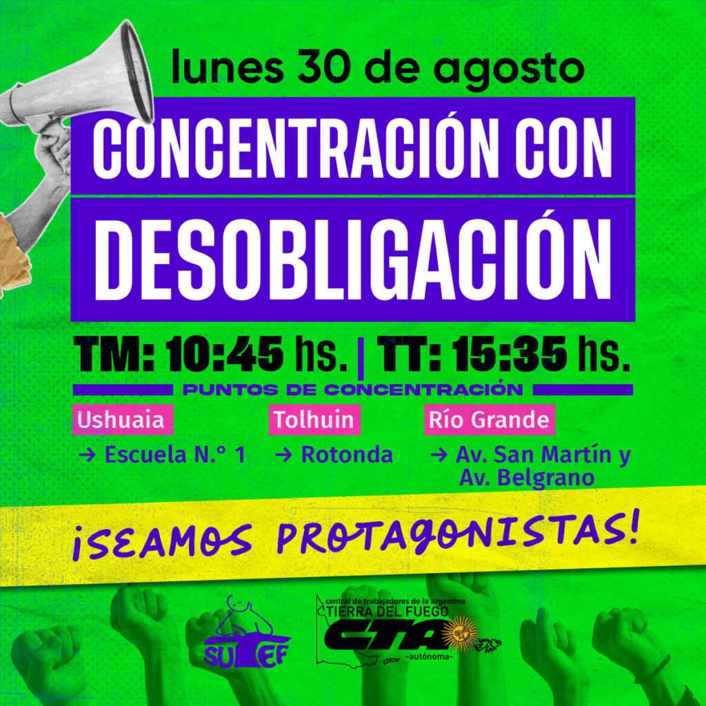 ✊ Sumemos compañeras, compañeros y salgamos a las calles en una nueva jornada de lucha con desobligaciones y concentraciones en las 3 ciudades, para que no haya #Ni1DocentePobre #Ni1DocentePrecarix en Tierra del Fuego.
