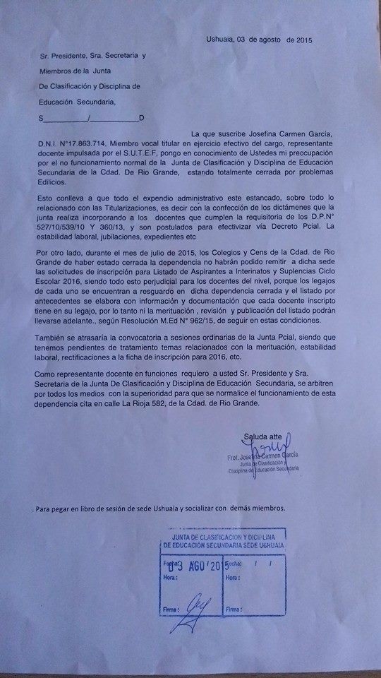 EducaciónJunta de Clasificación y Disciplina Nivel SecundarioAtención Docentes de Escuela Secundaria de Río Grande Atención Docentes de Escuela Secundaria de Río Grande publicado el 5 agosto, 2015 FacebookTwitterPinterestWhatsAppEmailImpresiónTelegramCopy URL Últimos artículos Comunicados / Informes / Noticias Solidaridad con la docencia de la Escuela Especial Kayú Chénèn El Sindicato Unificado de Trabajadoras y Trabajadores de la Educación Fueguina (SUTEF) expresa su... 1 noviembre, 2025 Comunicados e informes Informe de mesa paritaria salarial y consulta con la docencia Informe de Mesa Paritaria Salarial Este jueves 30 de octubre, se llevó adelante en la... 30 octubre, 2025 Más publicaciones Junta de Clasificación y Disciplina Nivel Secundario Nivel Secundario: prórroga de inscripción al listado de Interinatos y Suplencias Ciclo Lectivo 2026 🗓️ Las representantes gremiales de SUTEF en la Junta de Clasificación y Disciplina del... 28 junio, 2025 Junta de Clasificación y Disciplina Nivel Secundario Inscripción al listado de Interinatos y Suplencias Ciclo Lectivo 2026 🗓️ Las representantes gremiales de SUTEF en la Junta de Clasificación y Disciplina del... 27 mayo, 2025 Junta de Clasificación y Disciplina Nivel Secundario Nivel Secundario: publicación del listado complementario de interinatos y suplencias ciclo lectivo 2025 🗓️ Las representantes gremiales de SUTEF en la Junta de Clasificación y Disciplina del... 26 mayo, 2025
