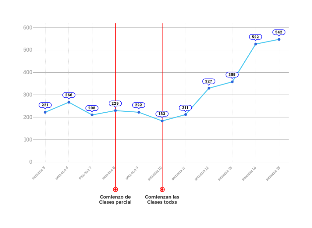 Se puede observar a continuación en el gráfico, el aumento de casos positivos de covid-19 en la Provincia cuando comenzaron las clases presenciales: