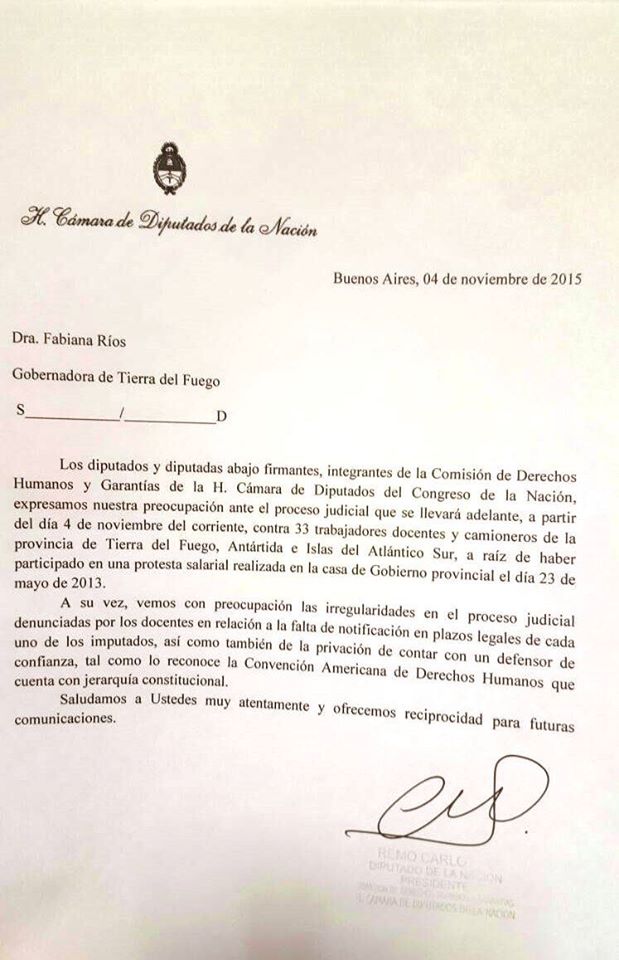 Carta de los diputados nacionales dirigida a la gobernadora Fabiana Ríos, manifiestan su preocupación por el hecho de llevar a juicio a 33 trabajadores por hechos sucedidos en el marco de una protesta social. También expresan preocupación por las irregularidades del proceso judicial.