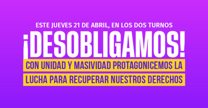 Este jueves 21 de abril, en los dos turnos desobligamos y concentramos para movilizar en Río Grande, Tolhuin y Ushuaia.