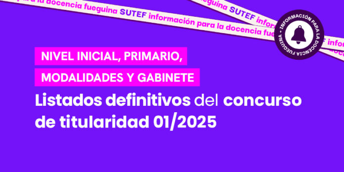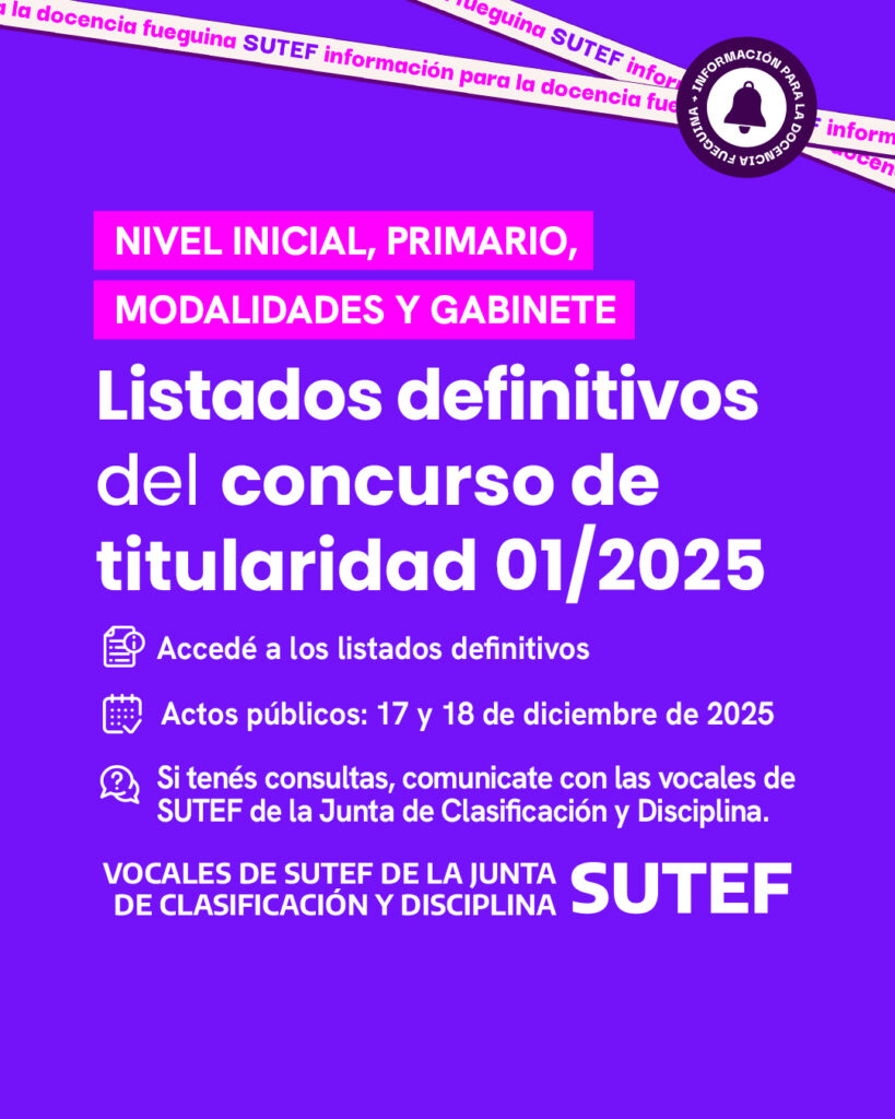 Las vocales de SUTEF en la Junta de Clasificación y Disciplina de Nivel Inicial, Primario, Modalidades y Personal de Gabinete informan a la docencia fueguina que se encuentran publicados los LISTADOS DEFINITIVOS DE CONCURSO DE TITULARIDAD 2025.