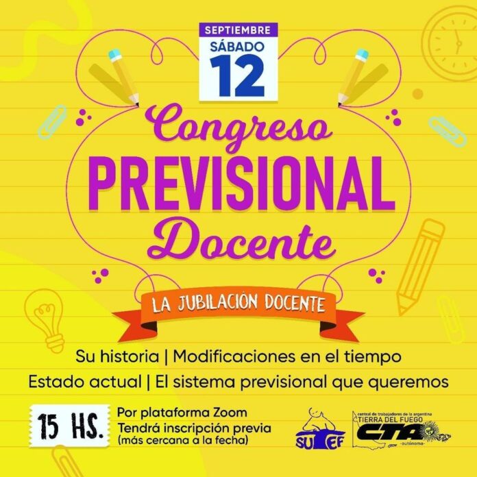 Seguridad SocialComunicados / Informes / NoticiasCongreso Previsional Docente Congreso Previsional Docente publicado el 3 septiembre, 2020 FacebookTwitterPinterestWhatsAppEmailImpresiónTelegramCopy URL Se realizará el día Sábado 12 de septiembre a las 15 hs. por plataforma Zoom.Requerirá inscripción previa que se realizará a partir de la semana próxima.¡Les esperamos! Últimos artículos Comunicados / Informes / Noticias Se realizó la proclamación de vocales electos de CPS y OSEF En la ciudad de Ushuaia, luego de concluido el escrutinio definitivo correspondiente a la... 28 noviembre, 2025 Caminatas Caminata de cierre al Corazón de la Isla – Tolhuin 🗓️ Fecha: domingo 07/12⏰ Horario: 10:30 hs. ⚠️ Cierre de inscripción: jueves 04/12 hasta las... 28 noviembre, 2025 Más publicaciones Comunicados / Informes / Noticias Se realizó la proclamación de vocales electos de CPS y OSEF En la ciudad de Ushuaia, luego de concluido el escrutinio definitivo correspondiente a la... 28 noviembre, 2025 Comunicados / Informes / Noticias Análisis de la reforma de OSEF El pasado martes 8 de julio, la legislatura de la provincia sancionó una ley... 10 julio, 2025 Comunicados / Informes / Noticias 08/07 Paro provincial en defensa de la OSEF Ante la posibilidad de que se trate y apruebe un proyecto de ley vinculado... 7 julio, 2025