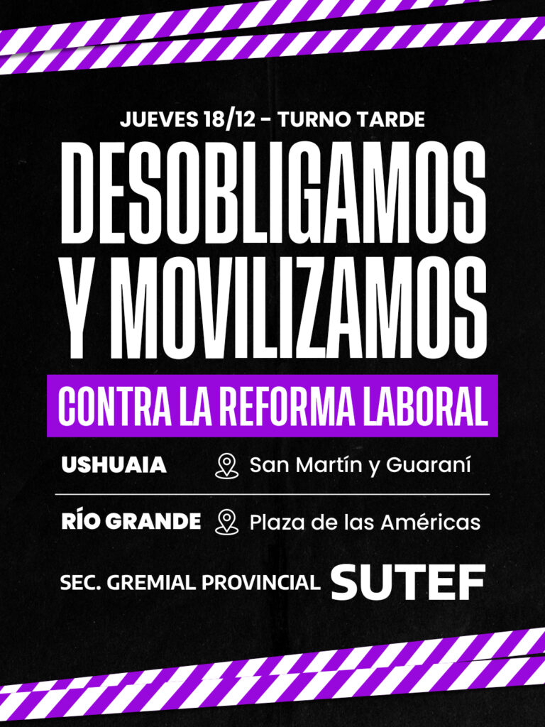 Desde nuestro sindicato informamos que el último Congreso Provincial de Delegadas y Delegados de SUTEF resolvió de manera unánime adherir a todas las medidas que se dispongan para esa fecha en Río Grande, Tolhuin y Ushuaia, en rechazo a la Ley de Modernización Laboral, la Ley de Libertad Educativa y las reformas previsionales e impositivas que afectan a los sectores populares.