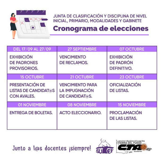 EducaciónJunta de Clasificación y Disciplina Nivel Inicial - Primario - Modalidades - GabineteCronograma de elecciones de Junta Cronograma de elecciones de Junta publicado el 23 septiembre, 2019 FacebookTwitterPinterestWhatsAppEmailImpresiónTelegramCopy URL Últimos artículos Comunicados e informes Informe del congreso provincial de delegadas/os y rectificación de las grillas salariales Este lunes 3 de noviembre, se llevó adelante el congreso provincial de delegadas y... 3 noviembre, 2025 Seguridad Social 07/11 Elecciones obligatorias de la Caja de Previsión Social y OSEF 🗓️ Viernes 7 de noviembre ⏰ De 8.00 y 18.00 hs. 🖥️ Consultá el padrón... 3 noviembre, 2025 Más publicaciones Junta de Clasificación y Disciplina Nivel Inicial - Primario - Modalidades - Gabinete Últimos días de inscripción al Listado para concurso de titularidad 01/2025 de Nivel Inicial, Primario, Modalidades y personal de Gabinete → Inscripción: hasta el martes 30 de septiembre de 2025 → Publicación de listados provisorios:... 29 septiembre, 2025 Junta de Clasificación y Disciplina Nivel Inicial - Primario - Modalidades - Gabinete N. inicial, primario, modalidades y gabinete: concurso de titularidad Las vocales de SUTEF de la Junta de Clasificación y Disciplina de Nivel Inicial,... 10 septiembre, 2025 Junta de Clasificación y Disciplina Nivel Inicial - Primario - Modalidades - Gabinete Últimos días de inscripción al listado de Interinatos y Suplencias Ciclo Lectivo 2026 Las vocales de SUTEF en la Junta de Clasificación y Disciplina de N. Inicial,... 26 junio, 2025