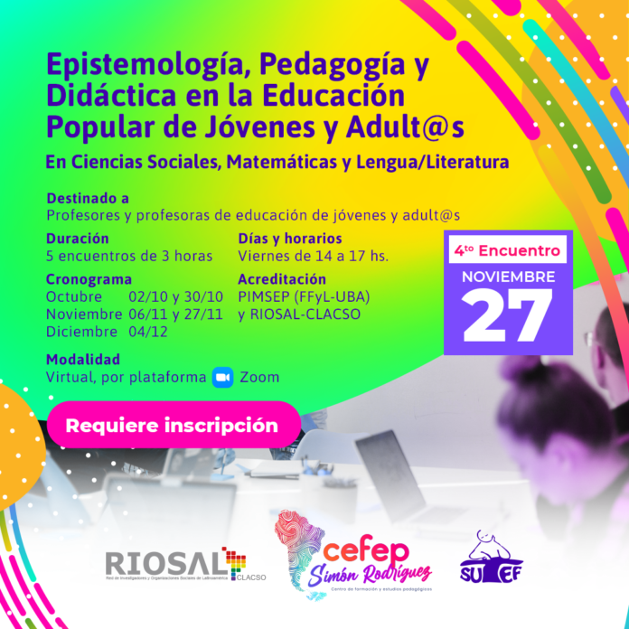Se llevará adelante el cuarto encuentro del Taller sobre Educación de Jóvenes y Adult@s, será este viernes 27 de noviembre de 14 hs. a 17 hs.