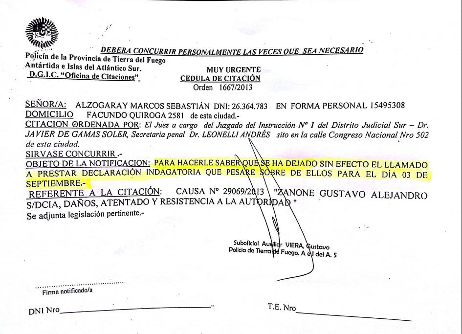 En el marco de las citaciones a declaración indagatoria, el día martes 3 de septiembre del 2013, los docentes de Ushuaia realizaron una desobligación en solidaridad con el compañero Marcos Alzogaray quien debía declarar a las 10:30 hs. Los maestros se concentraron en la puerta del juzgado. Alzogaray se ingresó al recinto de la justicia, donde le comunicaron que la indagatoria no se realizaría.