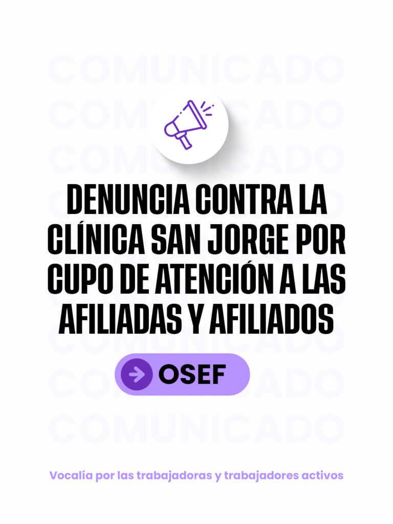 Desde la Vocalía por el sector activo de OSEF, informamos que se elevó ante la presidenta Mariana Hruby y el vicepresidente Gustavo García una denuncia formal contra la Clínica San Jorge por el trato discriminatorio y abusivo que están sufriendo nuestras afiliadas y afiliados.