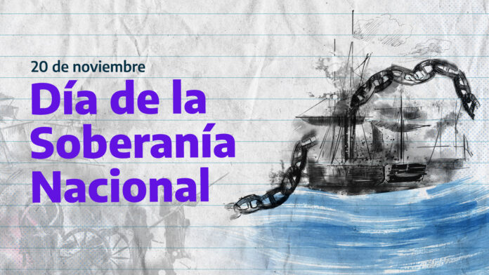 El 20 de noviembre se cumplen 177 años de la batalla de la Vuelta de Obligado, suceso por el cual se conmemora el Día de la Soberanía Nacional. Dicha batalla consistió en un enfrentamiento entre la Confederación Argentina y una flota anglo francesa que intentaba controlar la navegación de los ríos interiores. En ese momento Juan Manuel de Rosas estaba a cargo de las relaciones exteriores de la Confederación, era gobernador de la provincia de Buenos Aires y fue quien estuvo a cargo de la resistencia con el respaldo del general José de San Martín.