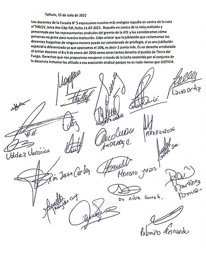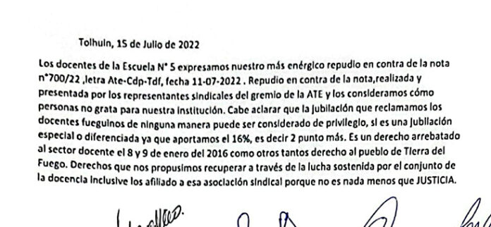Durante el día de hoy la docencia de la Escuela Nro. 5 de la ciudad de Tolhuin, manifestó su enérgico repudio contra la nota Nro. 700/22 presentada por el sindicato ATE al Gobernador de la Provincia y declaran como persona no gratas a representantes sindicales firmantes.