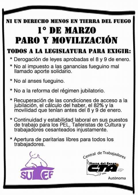 Noticias¡El 1ro todos paramos y movilizamos! ¡El 1ro todos paramos y movilizamos! publicado el 24 febrero, 2016 FacebookTwitterPinterestWhatsAppEmailImpresiónTelegramCopy URL Últimos artículos Comunicados / Informes / Noticias Informe de reunión con el Gobernador y el Ministro de Educación Tras reiterar nuestro pedido de audiencia urgente con el Gobernador y el Ministro de... 19 diciembre, 2025 Comunicados / Informes / Noticias SUTEF propuso a la CGT Ushuaia la creación del Consejo Provincial del Salario, las Condiciones Laborales y la Producción En una reunión ampliada con sindicatos y organizaciones sociales llevada adelante en la CGT... 19 diciembre, 2025 Más publicaciones Noticias Se conformó el Frente Nacional Democrático por la Educación Pública En un contexto de crisis educativa y laboral, se llevó a cabo el primer... 15 diciembre, 2025 Noticias SUTEF denuncia falta de instrumento legal y exige al Ministro garantías laborales para el Jardín nro. 27 El pasado martes 21 de octubre, el Sindicato Unificado de las Trabajadoras y Trabajadores... 27 octubre, 2025 Noticias Agenda gremial ️ Lunes 8 y martes 9 de septiembre Asamblea o desobligación interna en los tres... 8 septiembre, 2025