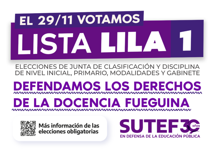 La docencia fueguina junto al SUTEF se trazó un camino de recuperación de derechos que el año pasado -con unidad, lucha y organización- logró recuperar el régimen previsional docente arrebatado por el gobierno de Bertone con un paquete de leyes de ajuste en el año 2015. Llamamos a toda la docencia a acompañar a la Lista LILA para continuar fortaleciendo y construyendo colectivamente este camino de recuperación y defensa de nuestros derechos.