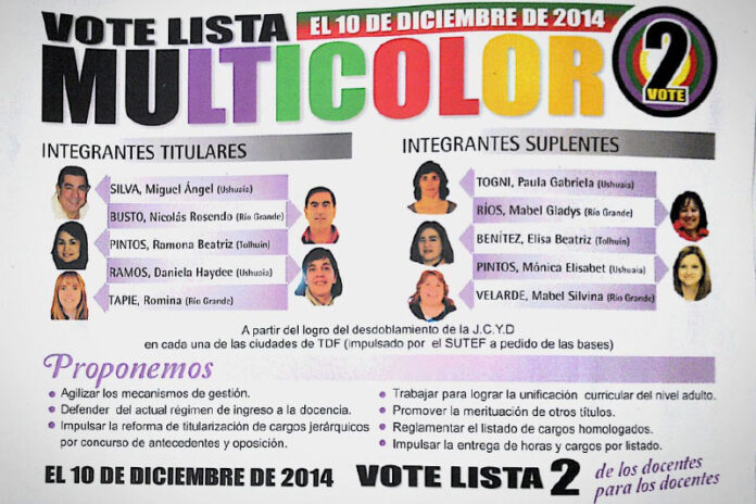 Recordamos que el 10 de diciembre se realizarán las elecciones de la Junta de Clasificación y Disciplina del Nivel Inicial Primaria Especial Gabinete y Adultos. La misma es de carácter obligatorio y el SUTEF presenta a sus candidatos en la LISTA 2 «Multicolor» Recordá llevar DNI el día de los comicios.En Ushuaia, el lugar de votación será en la Escuela 30, en Río Grande en la Escuela 2 y en Tolhuin en la Escuela 5. El horario será de 9 a 18 hs.