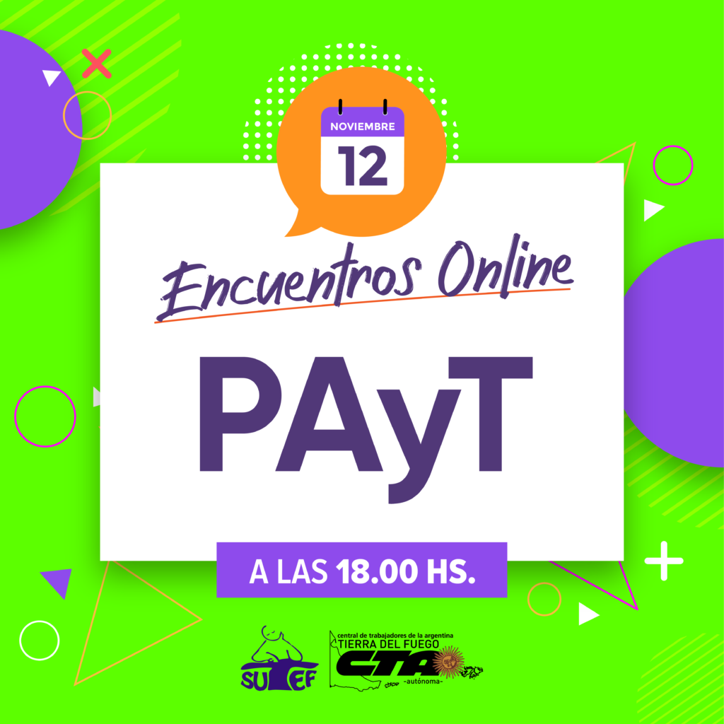 Convenio Colectivo de TrabajoConvocatoriasEncuentro con compañeros y compañeras PAyT Encuentro con compañeros y compañeras PAyT publicado el 12 noviembre, 2020 FacebookTwitterPinterestWhatsAppEmailImpresiónTelegramCopy URL Solicitá el link de Zoom para participar a: Julio +54 9 11 5606-6032 en UshuaiaAdriana +54 9 2964 60-5987 en Río GrandeLili +54 9 2964 61-8045 en Tolhuin Últimos artículos Comunicados / Informes / Noticias Solidaridad con la docencia de la Escuela Especial Kayú Chénèn El Sindicato Unificado de Trabajadoras y Trabajadores de la Educación Fueguina (SUTEF) expresa su... 1 noviembre, 2025 Comunicados e informes Informe de mesa paritaria salarial y consulta con la docencia Informe de Mesa Paritaria Salarial Este jueves 30 de octubre, se llevó adelante en la... 30 octubre, 2025 Más publicaciones Convocatorias CCT: reunión provincial con docencia de los Centros Populares de Cultura 🙋♀️ Se convoca a la docencia de los Centros Populares de Cultura a reunión... 2 julio, 2024 Convocatorias CCT: reunión provincial con maestras/os de lengua extranjera inglés 🙋♀️ Se convoca a maestras/os de lengua extranjera inglés de la provincia a participar... 17 junio, 2024 Convocatorias CCT: reunión provincial con bibliotecarias/os de Inicial, Primaria y Modalidades 🙋♀️ Se convoca a bibliotecarias/os de Inicial, primaria y modalidades de la provincia a... 6 junio, 2024