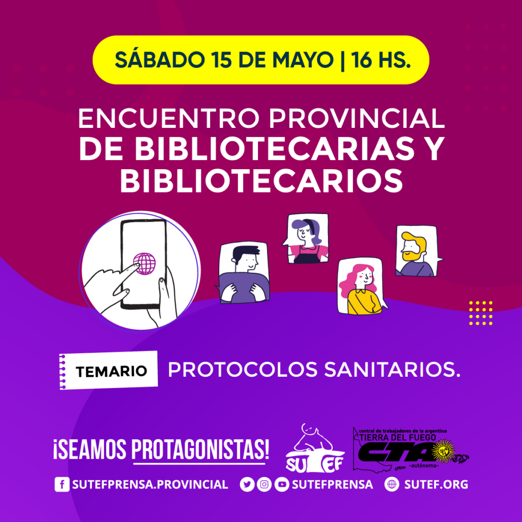 Convenio Colectivo de TrabajoConvocatoriasEncuentro Provincial de Bibliotecarias y Bibliotecarios Encuentro Provincial de Bibliotecarias y Bibliotecarios publicado el 14 mayo, 2021 FacebookTwitterPinterestWhatsAppEmailImpresiónTelegramCopy URL 💬 Encuentro Provincial de Bibliotecarias y Bibliotecarios 🗓 Sábado 15 de Mayo | 16 Hs.📝 Temario: Protocolos sanitarios.¡Solicitá link para participar! Adriana: 2964-605987 o Julio: 11-56066032 Últimos artículos Comunicados / Informes / Noticias ¡URGENTE! SUTEF Convoca a congreso provincial de delegadas/os este lunes 3/11 Desde el Sindicato Unificado de las Trabajadoras y Trabajadores de la Educación Fueguina (SUTEF)... 3 noviembre, 2025 Comunicados / Informes / Noticias Solidaridad con la docencia de la Escuela Especial Kayú Chénèn El Sindicato Unificado de Trabajadoras y Trabajadores de la Educación Fueguina (SUTEF) expresa su... 1 noviembre, 2025 Más publicaciones Convocatorias CCT: reunión provincial con docencia de los Centros Populares de Cultura 🙋♀️ Se convoca a la docencia de los Centros Populares de Cultura a reunión... 2 julio, 2024 Convocatorias CCT: reunión provincial con maestras/os de lengua extranjera inglés 🙋♀️ Se convoca a maestras/os de lengua extranjera inglés de la provincia a participar... 17 junio, 2024 Convocatorias CCT: reunión provincial con bibliotecarias/os de Inicial, Primaria y Modalidades 🙋♀️ Se convoca a bibliotecarias/os de Inicial, primaria y modalidades de la provincia a... 6 junio, 2024