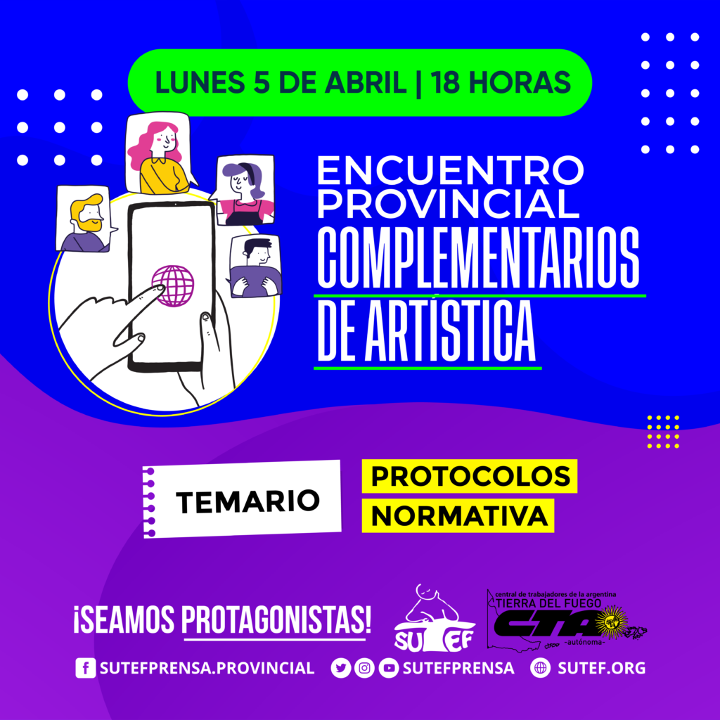 Convenio Colectivo de TrabajoConvocatoriasEncuentro Provincial de Complementarios de Artística Encuentro Provincial de Complementarios de Artística publicado el 1 abril, 2021 FacebookTwitterPinterestWhatsAppEmailImpresiónTelegramCopy URL 🗓 Lunes 5 de ABRIL | 18 Hs. 📝 Temario: protocolos y normativa ¡Solicitá link para participar! Adriana: 2964-605987 o Julio: 11-56066032 Últimos artículos Comunicados e informes Por mayoría de los mandatos, la docencia aceptó la propuesta salarial Con la participación de más de 140 delegadas, delegados e integrantes de Comisión Directiva... 6 noviembre, 2025 Comunicados / Informes / Noticias 06/11 – SUTEF convoca a congreso provincial de delegadas/os El Sindicato Unificado de Trabajadoras y Trabajadores de la Educación Fueguina (SUTEF) convoca a... 5 noviembre, 2025 Más publicaciones Convocatorias CCT: reunión provincial con docencia de los Centros Populares de Cultura 🙋♀️ Se convoca a la docencia de los Centros Populares de Cultura a reunión... 2 julio, 2024 Convocatorias CCT: reunión provincial con maestras/os de lengua extranjera inglés 🙋♀️ Se convoca a maestras/os de lengua extranjera inglés de la provincia a participar... 17 junio, 2024 Convocatorias CCT: reunión provincial con bibliotecarias/os de Inicial, Primaria y Modalidades 🙋♀️ Se convoca a bibliotecarias/os de Inicial, primaria y modalidades de la provincia a... 6 junio, 2024