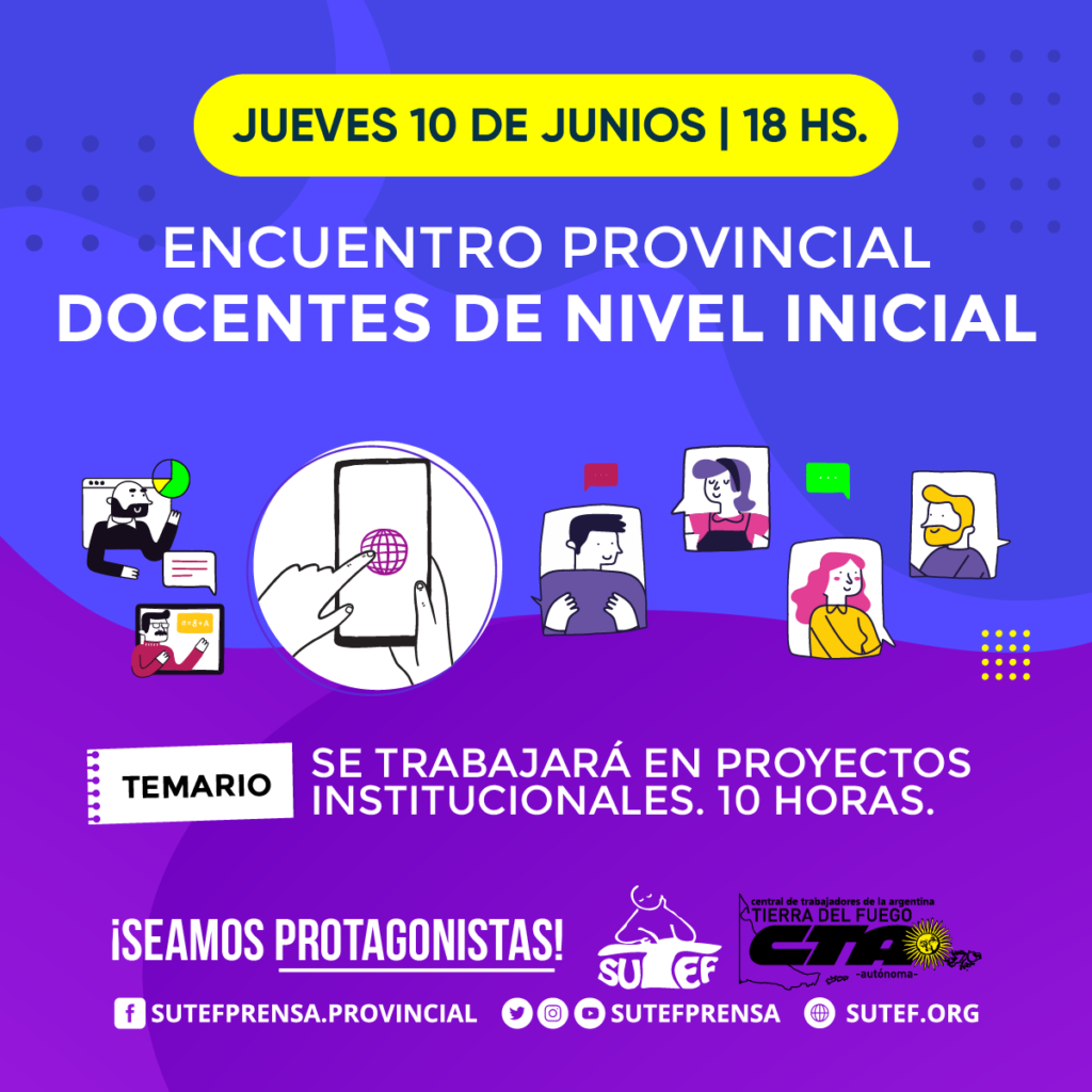 Convenio Colectivo de TrabajoConvocatoriasEncuentro Provincial de Docentes de Nivel Inicial Encuentro Provincial de Docentes de Nivel Inicial publicado el 8 junio, 2021 FacebookTwitterPinterestWhatsAppEmailImpresiónTelegramCopy URL ♦️ SUTEF convoca💬 Encuentro Provincial de Docentes de Nivel Inicial🗓 Jueves 10 de Junio | 18 Hs.📝 Temario: Se trabajará en Proyectos Institucionales. 10 horas. ¡Solicitá link para participar!Adriana: 2964-605987Julio: 11-56066032 Últimos artículos Comunicados / Informes / Noticias ¡URGENTE! SUTEF Convoca a congreso provincial de delegadas/os este lunes 3/11 Desde el Sindicato Unificado de las Trabajadoras y Trabajadores de la Educación Fueguina (SUTEF)... 3 noviembre, 2025 Comunicados / Informes / Noticias Solidaridad con la docencia de la Escuela Especial Kayú Chénèn El Sindicato Unificado de Trabajadoras y Trabajadores de la Educación Fueguina (SUTEF) expresa su... 1 noviembre, 2025 Más publicaciones Convocatorias CCT: reunión provincial con docencia de los Centros Populares de Cultura 🙋♀️ Se convoca a la docencia de los Centros Populares de Cultura a reunión... 2 julio, 2024 Convocatorias CCT: reunión provincial con maestras/os de lengua extranjera inglés 🙋♀️ Se convoca a maestras/os de lengua extranjera inglés de la provincia a participar... 17 junio, 2024 Convocatorias CCT: reunión provincial con bibliotecarias/os de Inicial, Primaria y Modalidades 🙋♀️ Se convoca a bibliotecarias/os de Inicial, primaria y modalidades de la provincia a... 6 junio, 2024