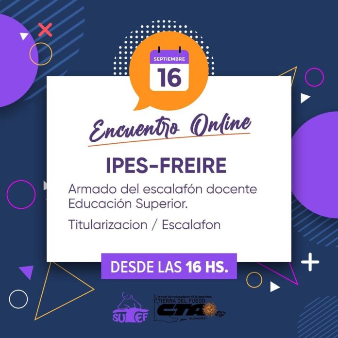 NoticiasConvenio Colectivo de TrabajoEncuentros Convenio Colectivo: IPES Paulo Freire Encuentros Convenio Colectivo: IPES Paulo Freire publicado el 14 septiembre, 2020 FacebookTwitterPinterestWhatsAppEmailImpresiónTelegramCopy URL 🔹 Armado del Escalafón Docente Educación Superior.🔹 Titularización. Escalafón.🗓 Miércoles 16 de septiembre.🕓 16 hs. Últimos artículos Comunicados / Informes / Noticias 06/11 – SUTEF convoca a congreso provincial de delegadas/os El Sindicato Unificado de Trabajadoras y Trabajadores de la Educación Fueguina (SUTEF) convoca a... 5 noviembre, 2025 Comunicados / Informes / Noticias Frente a otro hecho de violencia, el Jardín 18 se declara en estado de alerta y asamblea permanente Desde el Sindicato Unificado de Trabajadoras y Trabajadores de la Educación Fueguina (SUTEF) repudiamos... 5 noviembre, 2025 Más publicaciones Convenio Colectivo de Trabajo SUTEF impugnó la Resolución Nro. 2388/2023 del M.E.C.C. y T. que vulnera derechos laborales de la docencia SUTEF impugnó la Res. Nro. 2388/2023 del Ministerio de Educación, Ciencia, Cultura y Tecnología... 11 julio, 2023 Convenio Colectivo de Trabajo SUTEF impugnó la Resolución Nro. 2635/2023 del M.E.C.C. y T. que vulnera los derechos laborales de la docencia El viernes 7 de julio, SUTEF impugnó la Res. Nro. 2635/2023 del Ministerio de... 11 julio, 2023 Convenio Colectivo de Trabajo Documento para debatir en la jornada institucional de fecha 27/06/2023 Teniendo en cuenta que el día martes 27 de junio de 2023 se llevará... 26 junio, 2023