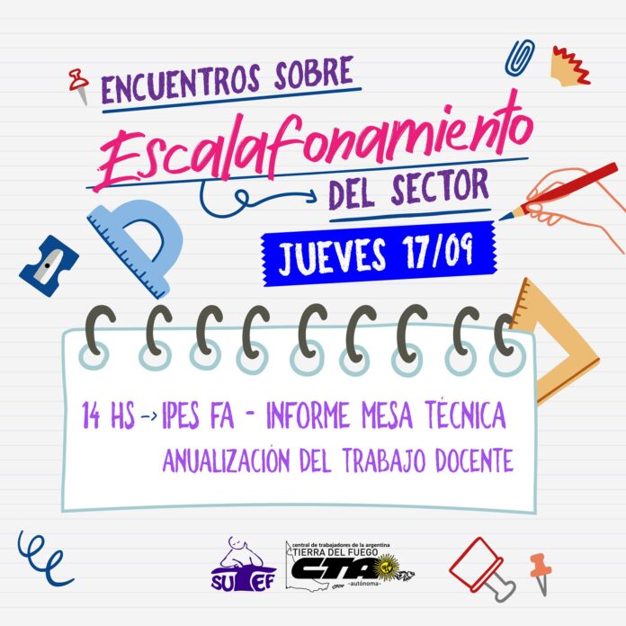 Convenio Colectivo de TrabajoConvocatoriasEncuentros sobre Escalafonamiento: IFES FA Encuentros sobre Escalafonamiento: IFES FA publicado el 16 septiembre, 2020 FacebookTwitterPinterestWhatsAppEmailImpresiónTelegramCopy URL Informe Mesa Técnica para IPES FA.Anualización del trabajo docente. Jueves 17 de Septiembre, 14 hs. Últimos artículos Comunicados e informes Informe del congreso provincial de delegadas/os y rectificación de las grillas salariales Este lunes 3 de noviembre, se llevó adelante el congreso provincial de delegadas y... 3 noviembre, 2025 Seguridad Social 07/11 Elecciones obligatorias de la Caja de Previsión Social y OSEF 🗓️ Viernes 7 de noviembre ⏰ De 8.00 y 18.00 hs. 🖥️ Consultá el padrón... 3 noviembre, 2025 Más publicaciones Convocatorias CCT: reunión provincial con docencia de los Centros Populares de Cultura 🙋♀️ Se convoca a la docencia de los Centros Populares de Cultura a reunión... 2 julio, 2024 Convocatorias CCT: reunión provincial con maestras/os de lengua extranjera inglés 🙋♀️ Se convoca a maestras/os de lengua extranjera inglés de la provincia a participar... 17 junio, 2024 Convocatorias CCT: reunión provincial con bibliotecarias/os de Inicial, Primaria y Modalidades 🙋♀️ Se convoca a bibliotecarias/os de Inicial, primaria y modalidades de la provincia a... 6 junio, 2024