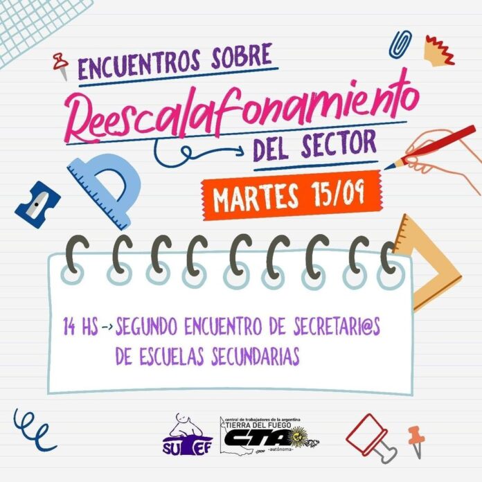 NoticiasConvenio Colectivo de TrabajoEncuentros sobre Reescalafonamiento del Sector: 2do encuentro de Secretari@s de Escuelas Secundarias Encuentros sobre Reescalafonamiento del Sector: 2do encuentro de Secretari@s de Escuelas Secundarias publicado el 14 septiembre, 2020 FacebookTwitterPinterestWhatsAppEmailImpresiónTelegramCopy URL Martes 15 de Septiembre, 14 hs. ➡️ Secretari@s de Escuelas Secundarias. Pedí el link al Secretario Gremial Provincial Julio Beriau al 011- 56066032 Últimos artículos Comunicados / Informes / Noticias ¡Basta de Violencia! SUTEF convoca a congreso provincial de delegadas/os urgente para este 08/11 Ante la escalada de hechos de violencia que afectan gravemente a nuestras instituciones educativas... 7 noviembre, 2025 Seguridad Social Gracias por acompañarnos con tu voto Este viernes 7 de noviembre de 2025 se llevaron adelante las elecciones de vocales... 7 noviembre, 2025 Más publicaciones Convenio Colectivo de Trabajo SUTEF impugnó la Resolución Nro. 2388/2023 del M.E.C.C. y T. que vulnera derechos laborales de la docencia SUTEF impugnó la Res. Nro. 2388/2023 del Ministerio de Educación, Ciencia, Cultura y Tecnología... 11 julio, 2023 Convenio Colectivo de Trabajo SUTEF impugnó la Resolución Nro. 2635/2023 del M.E.C.C. y T. que vulnera los derechos laborales de la docencia El viernes 7 de julio, SUTEF impugnó la Res. Nro. 2635/2023 del Ministerio de... 11 julio, 2023 Convenio Colectivo de Trabajo Documento para debatir en la jornada institucional de fecha 27/06/2023 Teniendo en cuenta que el día martes 27 de junio de 2023 se llevará... 26 junio, 2023