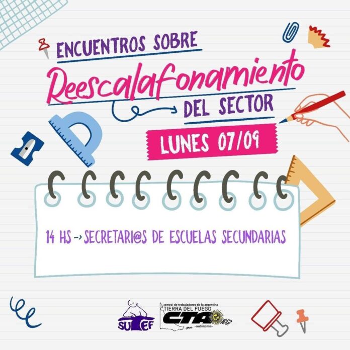Convenio Colectivo de TrabajoConvocatoriasEncuentros sobre Reescalafonamiento del Sector: Secretari@s de Escuelas Secundarias Encuentros sobre Reescalafonamiento del Sector: Secretari@s de Escuelas Secundarias publicado el 7 septiembre, 2020 FacebookTwitterPinterestWhatsAppEmailImpresiónTelegramCopy URL Últimos artículos Comunicados / Informes / Noticias Solidaridad con la docencia de la Escuela Especial Kayú Chénèn El Sindicato Unificado de Trabajadoras y Trabajadores de la Educación Fueguina (SUTEF) expresa su... 1 noviembre, 2025 Comunicados e informes Informe de mesa paritaria salarial y consulta con la docencia Informe de Mesa Paritaria Salarial Este jueves 30 de octubre, se llevó adelante en la... 30 octubre, 2025 Más publicaciones Convocatorias CCT: reunión provincial con docencia de los Centros Populares de Cultura 🙋♀️ Se convoca a la docencia de los Centros Populares de Cultura a reunión... 2 julio, 2024 Convocatorias CCT: reunión provincial con maestras/os de lengua extranjera inglés 🙋♀️ Se convoca a maestras/os de lengua extranjera inglés de la provincia a participar... 17 junio, 2024 Convocatorias CCT: reunión provincial con bibliotecarias/os de Inicial, Primaria y Modalidades 🙋♀️ Se convoca a bibliotecarias/os de Inicial, primaria y modalidades de la provincia a... 6 junio, 2024