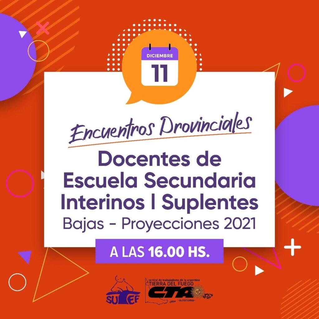 Convenio Colectivo de TrabajoConvocatoriasEncuentros SUTEF: Docentes interinas/os y suplentes Encuentros SUTEF: Docentes interinas/os y suplentes publicado el 11 diciembre, 2020 FacebookTwitterPinterestWhatsAppEmailImpresiónTelegramCopy URL Convenio Colectivo de Docentes interin@s y suplentesBajas/ Proyecciones 2021Viernes 11 de diciembre, 16:00 horas. Construyamos junt@s«Protagonizamos o nos protagonizan»Solicitá link de Zoom a Julio +54 9 11 5606-6032 ó Adriana +54 9 2964 60-5987 Últimos artículos Comunicados e informes Informe del congreso provincial de delegadas/os y rectificación de las grillas salariales Este lunes 3 de noviembre, se llevó adelante el congreso provincial de delegadas y... 3 noviembre, 2025 Seguridad Social 07/11 Elecciones obligatorias de la Caja de Previsión Social y OSEF 🗓️ Viernes 7 de noviembre ⏰ De 8.00 y 18.00 hs. 🖥️ Consultá el padrón... 3 noviembre, 2025 Más publicaciones Convocatorias CCT: reunión provincial con docencia de los Centros Populares de Cultura 🙋♀️ Se convoca a la docencia de los Centros Populares de Cultura a reunión... 2 julio, 2024 Convocatorias CCT: reunión provincial con maestras/os de lengua extranjera inglés 🙋♀️ Se convoca a maestras/os de lengua extranjera inglés de la provincia a participar... 17 junio, 2024 Convocatorias CCT: reunión provincial con bibliotecarias/os de Inicial, Primaria y Modalidades 🙋♀️ Se convoca a bibliotecarias/os de Inicial, primaria y modalidades de la provincia a... 6 junio, 2024