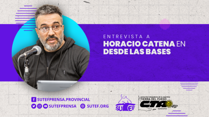 EN LOS MEDIOS Entrevista a Horacio Catena en Desde las Bases – FM Nuestras Voces publicado el 21 julio, 2021 FacebookTwitterPinterestWhatsAppEmailImpresiónTelegramCopy URL Más publicaciones SUTEF en los medios “El gobernador tiene la responsabilidad política de convocar y buscar una solución mínima” Río Grande – El secretario General del SUTEF a nivel provincial, Horacio Catena, en... 23 octubre, 2025 00:14:26 SUTEF en los medios «Los trabajadores expresamos nuestro malestar» Horacio Catena, secretario general del Sindicato Unificado de las Trabajadoras y Trabajadores de la... 30 septiembre, 2025 SUTEF en los medios Los docentes lideran el rechazo a la visita de Milei a Ushuaia con un banderazo por la Soberanía La visita de campaña del presidente Javier Milei a Ushuaia, programada para este lunes... 29 septiembre, 2025