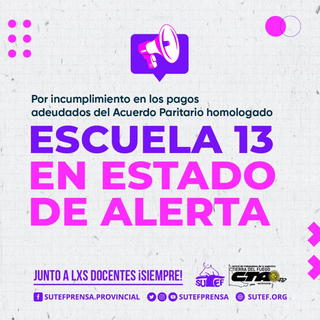Las y los docentes de la Escuela N.° 13 se encuentran en ESTADO DE ALERTA ante el incumplimiento del Gobierno del Acuerdo Paritario homologado en 2021 para las escuelas de jornada completa.