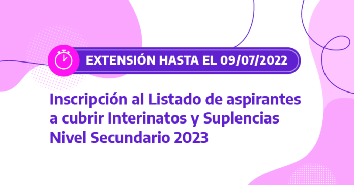 Informamos a la docencia que se extiende la fecha de inscripción hasta el día 09/07/2022 INCLUSIVE para el Listado de Aspirantes a cubrir Interinatos y Suplencias de Espacios Curriculares, Asignaturas y/o Cargos de 1° a 7° año de la Educación Secundaria Obligatoria (E.S.O.) y Centros Educativos de Nivel Secundario (C.E.N.S.) para el Ciclo Lectivo 2023.