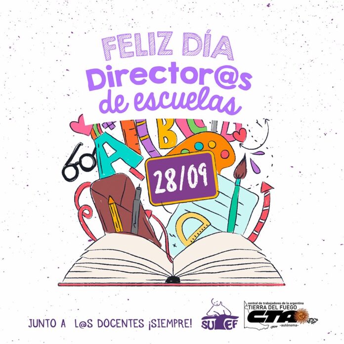 NoticiasFeliz día a las directoras y directores de escuelas Feliz día a las directoras y directores de escuelas publicado el 28 septiembre, 2019 FacebookTwitterPinterestWhatsAppEmailImpresiónTelegramCopy URL Feliz día a las directoras y directores de escuelas les desea el SUTEF. ¡SIGAMOS LUCHANDO POR LA DEFENSA Y VALORACIÓN DE LA CARRERA DOCENTE! Últimos artículos Comunicados / Informes / Noticias 06/11 – SUTEF convoca a congreso provincial de delegadas/os El Sindicato Unificado de Trabajadoras y Trabajadores de la Educación Fueguina (SUTEF) convoca a... 5 noviembre, 2025 Comunicados / Informes / Noticias Frente a otro hecho de violencia, el Jardín 18 se declara en estado de alerta y asamblea permanente Desde el Sindicato Unificado de Trabajadoras y Trabajadores de la Educación Fueguina (SUTEF) repudiamos... 5 noviembre, 2025 Más publicaciones Noticias SUTEF denuncia falta de instrumento legal y exige al Ministro garantías laborales para el Jardín nro. 27 El pasado martes 21 de octubre, el Sindicato Unificado de las Trabajadoras y Trabajadores... 27 octubre, 2025 Noticias Agenda gremial ️ Lunes 8 y martes 9 de septiembre Asamblea o desobligación interna en los tres... 8 septiembre, 2025 Noticias 05/09 Paro y marcha educativa provincial Por nuestro salario y la sanción urgente de la Ley de Financiamiento Educativo... 4 septiembre, 2025