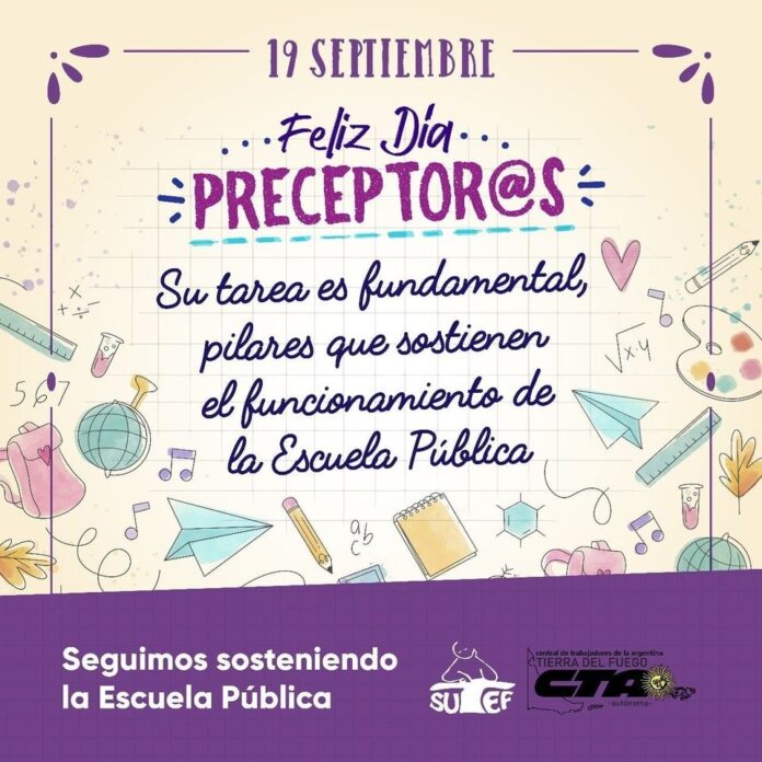 NivelesSecundaria y Superior¡Feliz día preceptores y preceptoras! ¡Feliz día preceptores y preceptoras! publicado el 19 septiembre, 2020 FacebookTwitterPinterestWhatsAppEmailImpresiónTelegramCopy URL Su tarea es fundamental en el funcionamiento de la Escuela Pública… Últimos artículos Comunicados / Informes / Noticias Cambio de horario y lugar de conferencia de prensa frente a la violencia contra la docencia El Sindicato Unificado de Trabajadoras y Trabajadores de la Educación Fueguina (SUTEF) se dirige... 9 noviembre, 2025 Comunicados / Informes / Noticias 10/11 Paro provincial de 24 hs. ¡Basta de violencia contra la docencia! 📅 Lunes 10/11 📢 Paro provincial de 24 hs. 🛑 ¡Basta de violencia contra... 8 noviembre, 2025 Más publicaciones Junta de Clasificación y Disciplina Nivel Secundario Nivel Secundario: cronograma Listado Complementario de Aspirantes a cubrir Interinatos y Suplencias Las representantes gremiales de SUTEF en la Junta de Clasificación y Disciplina del Nivel... 15 mayo, 2025 Secundaria y Superior SUTEF pidió pase de agentes PAyT a Auxiliares de Secretaría SUTEF presentó un reclamo formal ante el ministro de Educación, Pablo López Silva, para... 1 abril, 2025 Junta de Clasificación y Disciplina Nivel Secundario Nivel Secundario: cronograma para aspirantes a Interinatos y Suplencias Ciclo Lectivo 2025 Las vocales de SUTEF de la Junta de Clasificación y Disciplina Nivel Secundario informan... 5 febrero, 2025