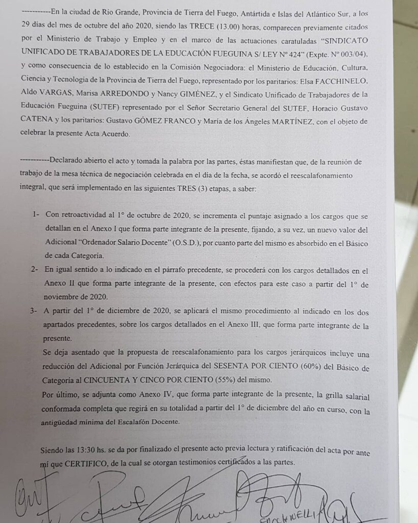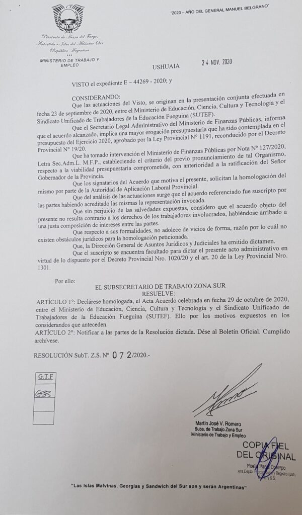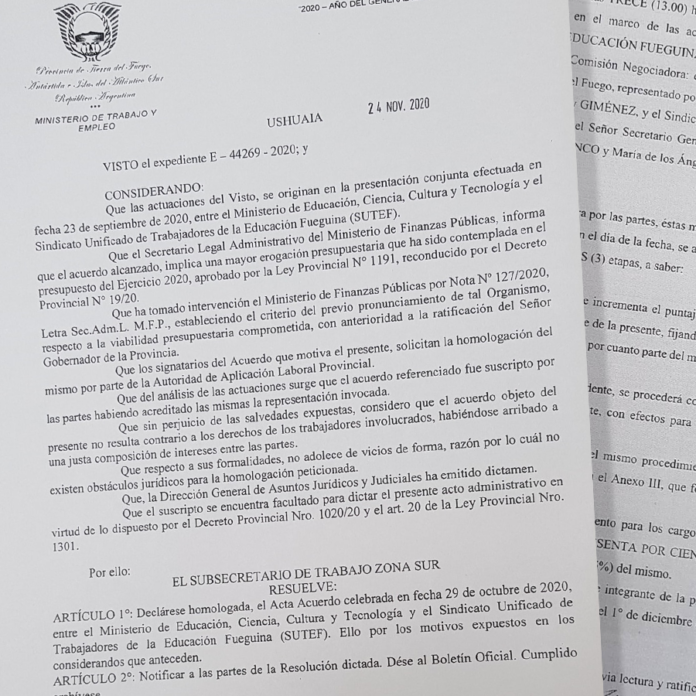 El Ministerio de Trabajo declaró homologada el acta acuerdo celebrada el 29 de octubre entre el SUTEF y el Ministerio de Educación.