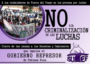Con motivo de realizarse el 17 de octubre en el Centro Beagle el II Acto contra la Criminalización de la Protesta Social SE CONVOCA A TODOS LOS ARTISTAS y a todas aquellas personas interesadas en participar en la organización a una reunión el día jueves 25 del corriente a las 18:30 hs en la sede de SUTEF Ushuaia, H. Yrigoyen 1380. Los esperamos