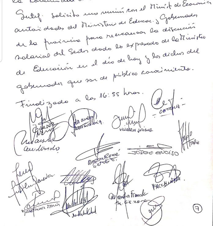 En el final del acta, en presencia de la Ministra, se dejó expresa constancia del pedido de una reunión con el Ministro de Economía, con la cartera educativa y el Gobernador de la Provincia para reencauzar la discusión salarial, dado los dichos de la Ministra de hoy y las declaraciones del Gobernador en estos días.