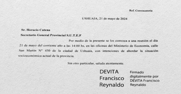 Durante la mañana de este martes 21 de mayo, SUTEF fue convocado a las 14 hs. a una reunión con el Ministro de Economía de la Provincia, Francisco Devita, en la ciudad de Ushuaia.