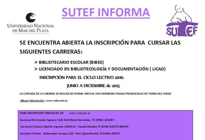 NoticiasFormaciónInscripción para cursar carreras Inscripción para cursar carreras publicado el 14 octubre, 2015 FacebookTwitterPinterestWhatsAppEmailImpresiónTelegramCopy URL Últimos artículos Seguridad Social 07/11 Elecciones obligatorias de la Caja de Previsión Social y OSEF 🗓️ Viernes 7 de noviembre ⏰ De 8.00 y 18.00 hs. 🖥️ Consultá el padrón... 3 noviembre, 2025 Acción Social Hay que defender los derechos conseguidos, garantizar su cumplimiento y avanzar por más https://youtube.com/shorts/7G5C1QKJF90?feature=share 🗓 Un lunes 31 de octubre de 2022, producto de una larga lucha colectiva,... 3 noviembre, 2025 Más publicaciones Formación Último encuentro de la capacitación CUESTIÓN MALVINAS 🗓️ El próximo sábado 1 de noviembre se llevará adelante el último encuentro de... 29 octubre, 2025 Formación Capacitación docente «Accesibilidad e Inclusión: un binomio inseparable para la equidad educativa» Invitamos a la docencia de todas las áreas, niveles y modalidades de Tierra del... 27 octubre, 2025 Formación Cuarto encuentro de la capacitación CUESTIÓN MALVINAS El próximo sábado 18 de octubre se llevará adelante el tercer encuentro de "Cuestión... 16 octubre, 2025