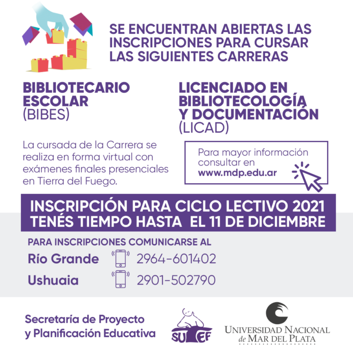 La cursada de la Carrera se realiza en forma virtual a través de la Universidad Nacional de Mar del Plata, con exámenes finales presenciales en Tierra del Fuego. Para mayor información sobre las carreras consultar en www.mdp.edu.ar