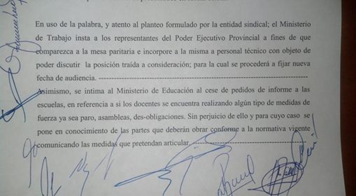 En el día de la fecha 2 de septiembre del 2014, se realizó la reunión paritaria salarial en Río Grande. No hubo ninguna propuesta salarial por parte del Gobierno. El pequeño avance que se logró fue que, a pedido del sindicato, el Ministerio de Trabajo intimó al Ministerio de Educación a cesar con el pedido a los directivos de informar paros, desobligaciones y asambleas debido a que es un hecho de persecución gremial. Además, la cartera laboral solicita a la Legislatura que participe como tercero en la paritaria a través de la Comisión de Seguimiento Laboral.
