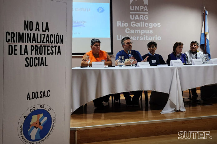 Este jueves 29 de septiembre se llevó adelante -en el salón Iris Bergero de la Universidad Nacional de la Patagonia Austral en la ciudad de Río Gallegos, Provincia de Santa Cruz- la primera Jornada Nacional Contra la Criminalización de la Protesta Social organizada por la Asociación de Docentes de Santa Cruz (ADOSAC).