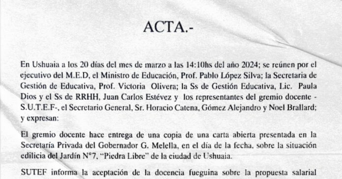 A continuación, desde SUTEF se comunicó la aceptación de la docencia fueguina a la propuesta ofrecida el pasado viernes 15 de marzo (ver propuesta sutef.org/mesapartiria16mar24).