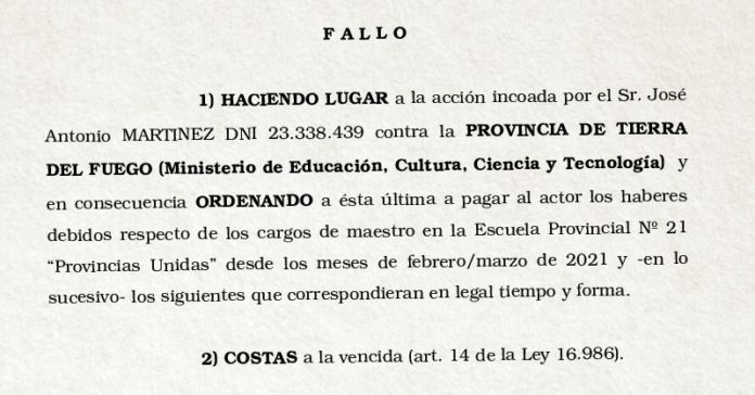 Al inicio del fallo, consignan fehacientemente que José Martínez “en fecha 26-02-2021 fue dado de alta en el cargo de maestro en la Escuela Provincial Nº 21 “Provincias Unidas” de la ciudad de Río Grande, tras haber resultado primero en el orden de mérito del listado confeccionado por la Junta de Clasificación y Disciplina”.