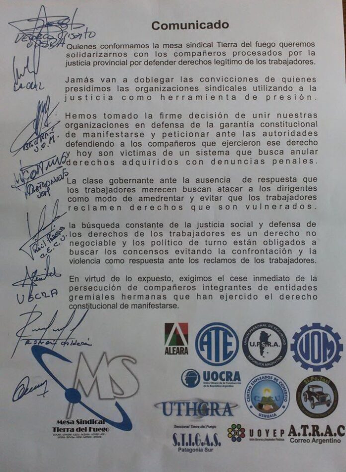 Quienes conformamos la mesa sindical Tierra del Fuego queremos solidarizarnos con los compañeros procesados por la justicia provincial por defender derechos legítimos de los trabajadores.