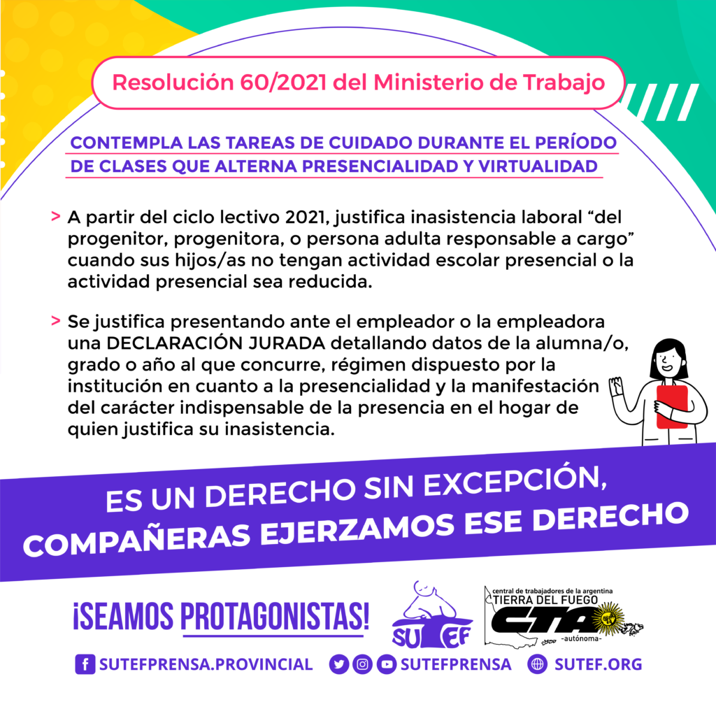 Resolución Ministerio de Trabajo de Nación 60/21 publicado en Boletín Oficial 12/02. El Ministerio de Trabajo de Nación dispuso que a partir del inicio del ciclo lectivo 2021 en cada jurisdicción, se considerará justificada la inasistencia de la progenitora/or o persona adulta responsable a cargo cuya presencia en el hogar sea indispensable para el cuidado de la niña/o u adolescente en los siguientes casos: