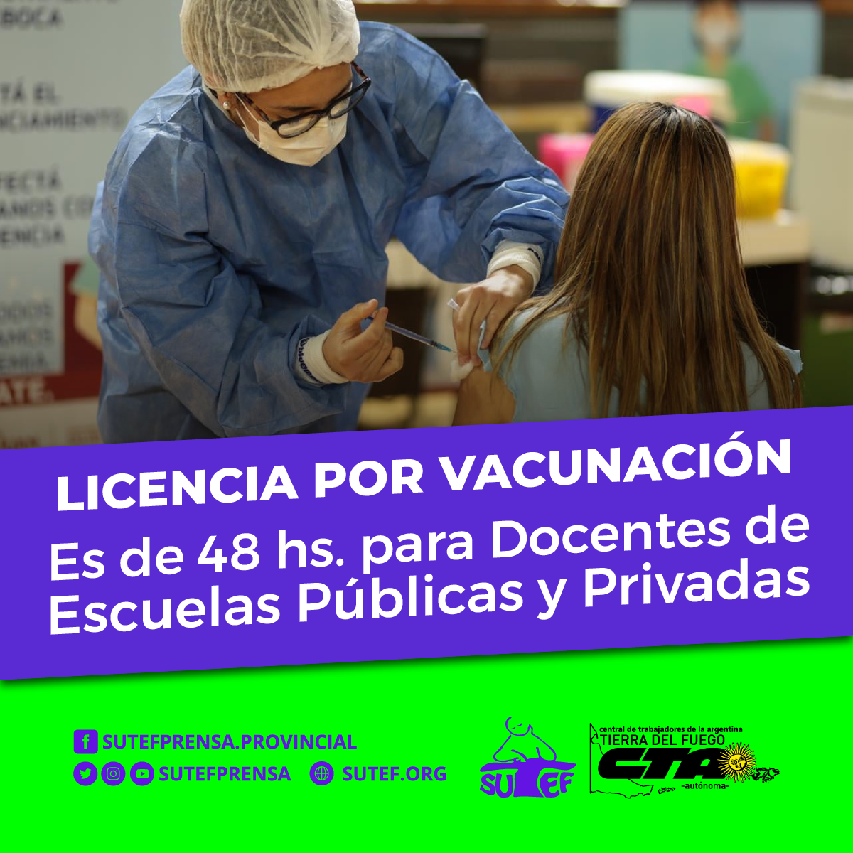 Recordamos a toda la docencia que las 48 horas de licencia que otorga el Ministerio de Educación al personal docente que se vacuna por COVID-19 es para docentes que trabajan tanto en la gestión pública como en la gestión privada. Es el día de la vacunación y el día siguiente.
